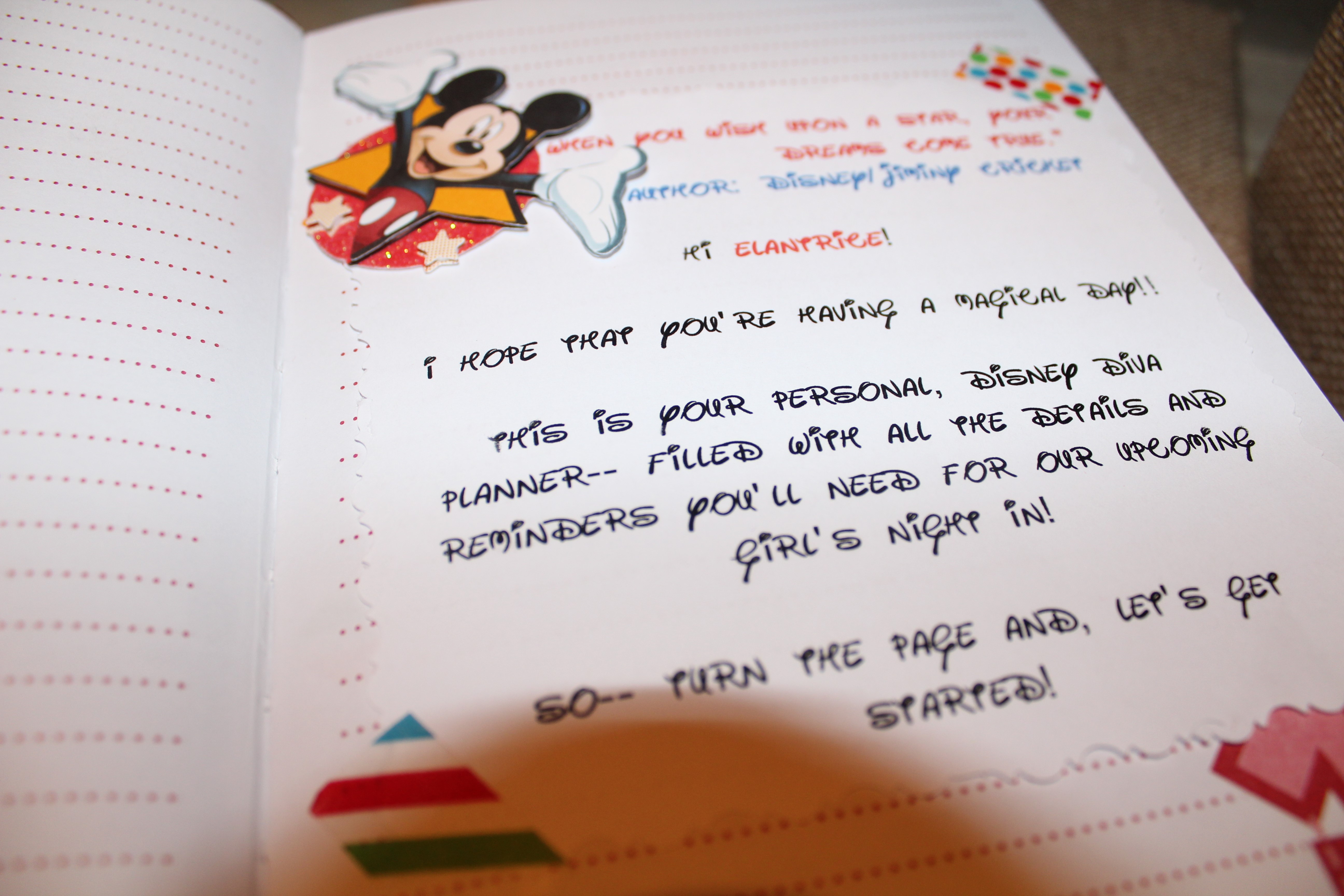 I typed up and printed out– all the specifics for our Disney themed, Girl’s Night In. I found some cute Disney stickers at my local Michael’s and secured them to the pages of the planner. Each planner was placed inside an unassuming box and, mailed via UPS.