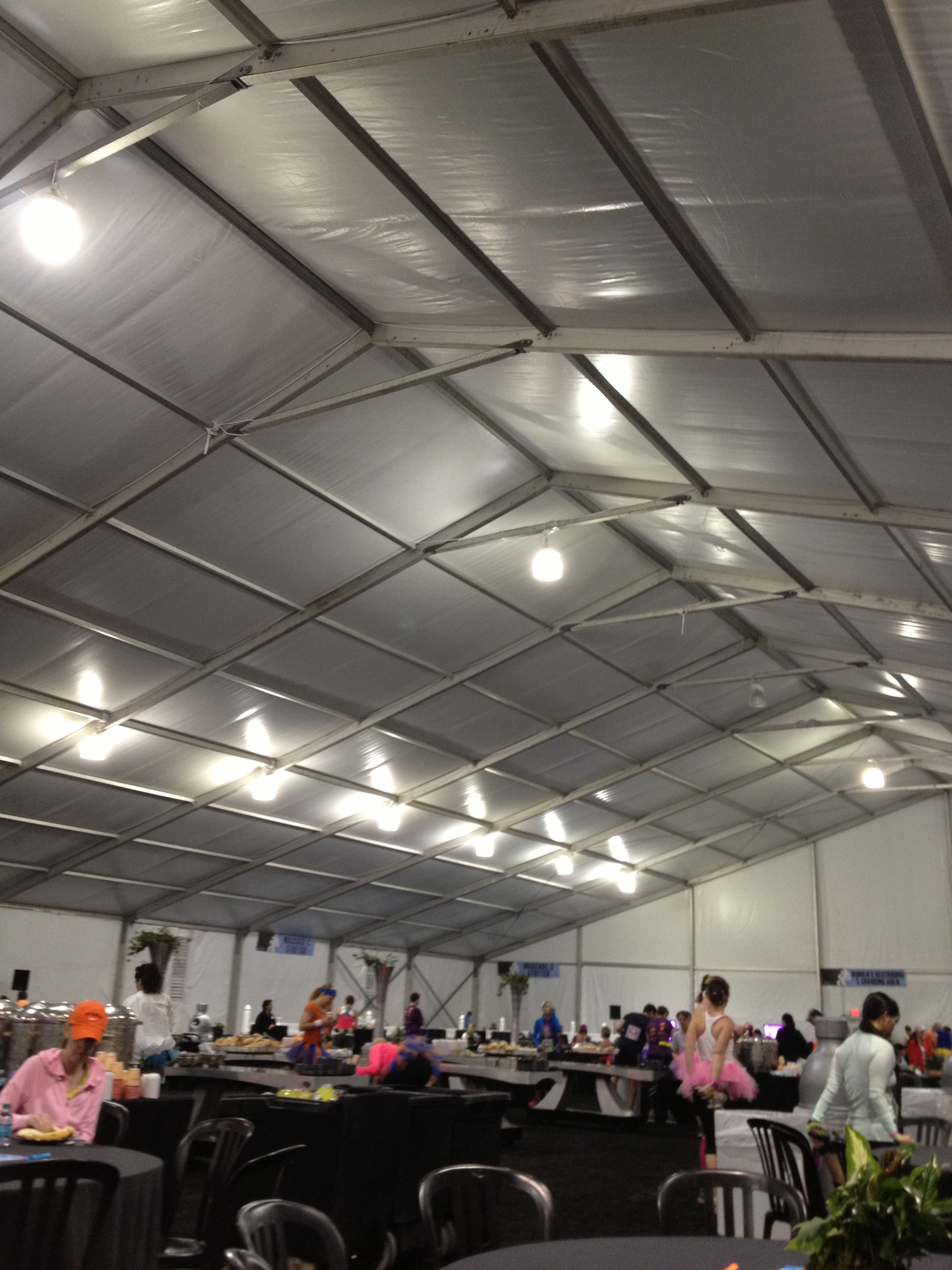 After getting my medal, I made my way to the Race Retreat. I did not have a lot of time to spend here before the race. Before entering my corral I had a bagel and cream cheese. I made sure to go back there for breakfast, which consisted of eggs, hash browns, bacon, oatmeal, fruit, coffee, muffins, cinnamon rolls, Powerade, and water. There were several tables set up under a large tent. Race participants were given pink flip flops and a towel. I would pay for the Race Retreat again and make sure I participate in the offers before the race.