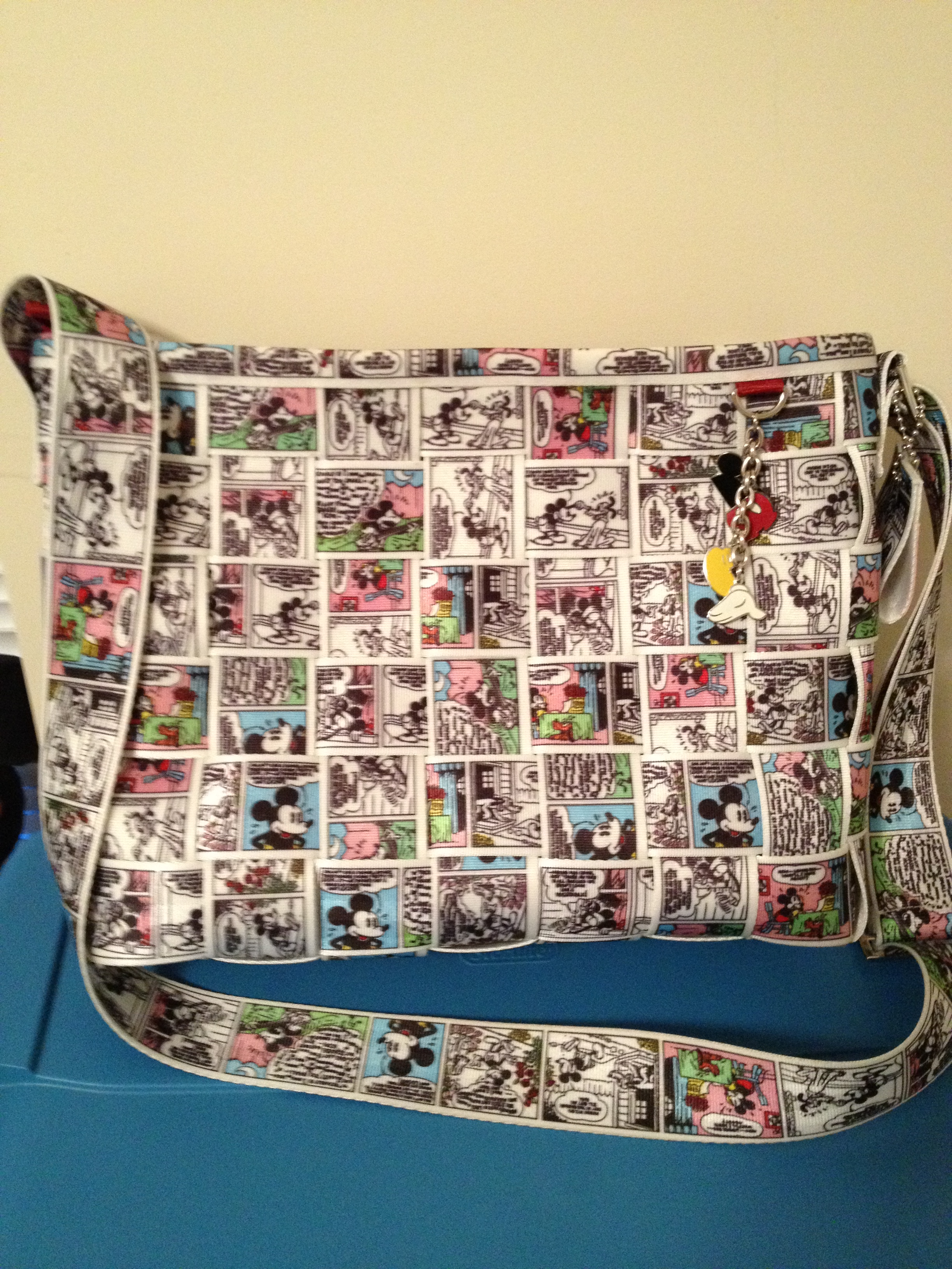 The item I am presenting this Friday is the Disney Classic Messenger made by Harveys The Original Seatbelt Bags. Now I will warn you that I have a thing for bags. I was first introduced to these bags in 2009 while in California for the D23 Expo. Since that was my first time at Disneyland, I was walking around Downtown Disney and saw one of the bags in a window. I had to go into the store to inspect the bag even closer. I love being different and a bag made out of seatbelts was right up my alley. I currently own three Harveys bags, with 2 being Disney. The bag really is made of automotive seatbelts printed with a Mickey Mouse comic strip. Other Disney touches included Mickey Mouse charms, Mickey ears zipper pull and a Disney lining. I can fit a binder, wallet, and iPad inside with some room to spare. The bag can be purchased at Harveys Seatbelt Bags . The messenger retails for $168.