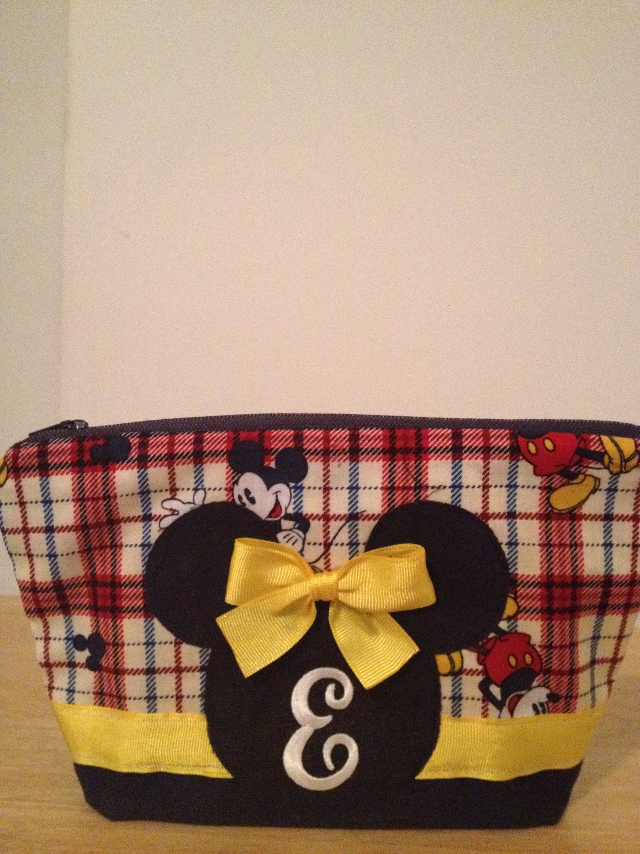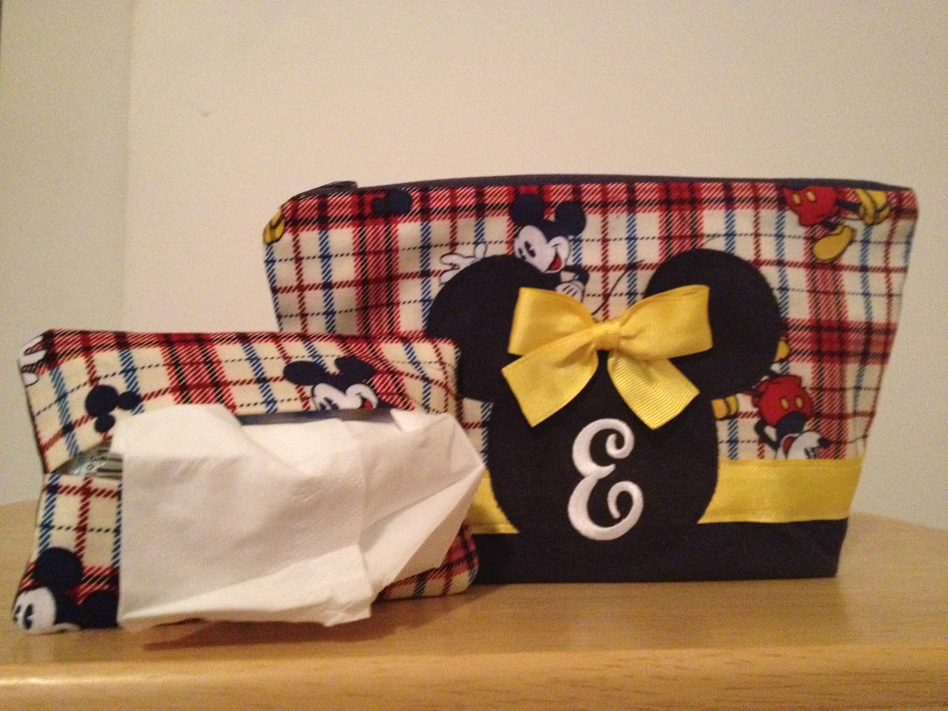 I will use it as a makeup bag for traveling. I think the matching tissue case is just adorable (travel size tissue is not included). Leslie asked if I wanted to keep the buttons or replace with a Mickey Mouse head iron-on. I opted for the iron-on and I was surprised to see my initial on it.