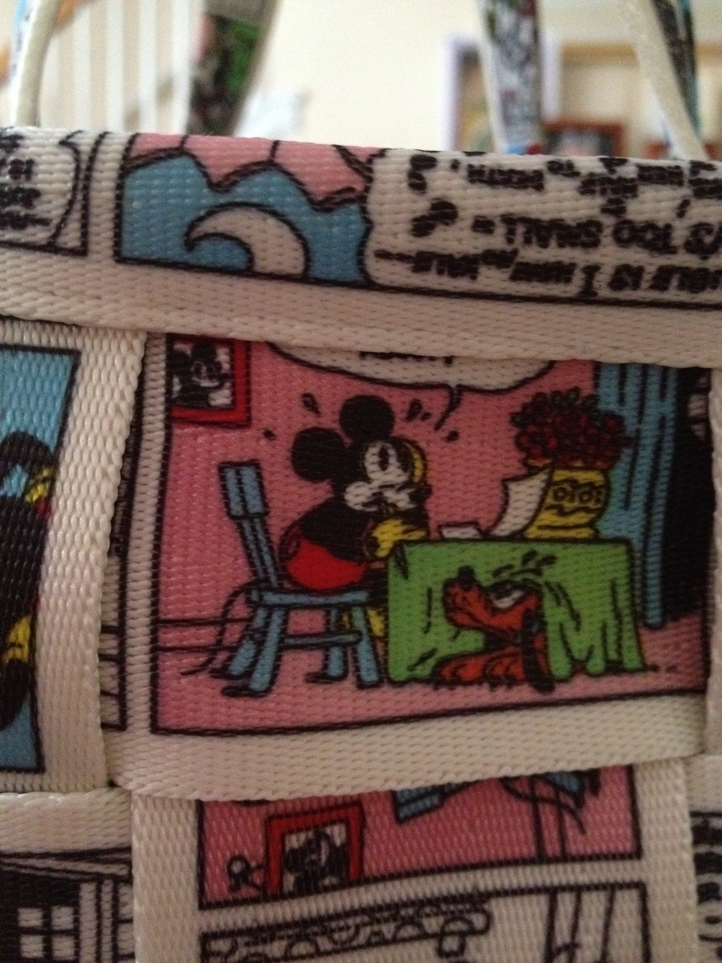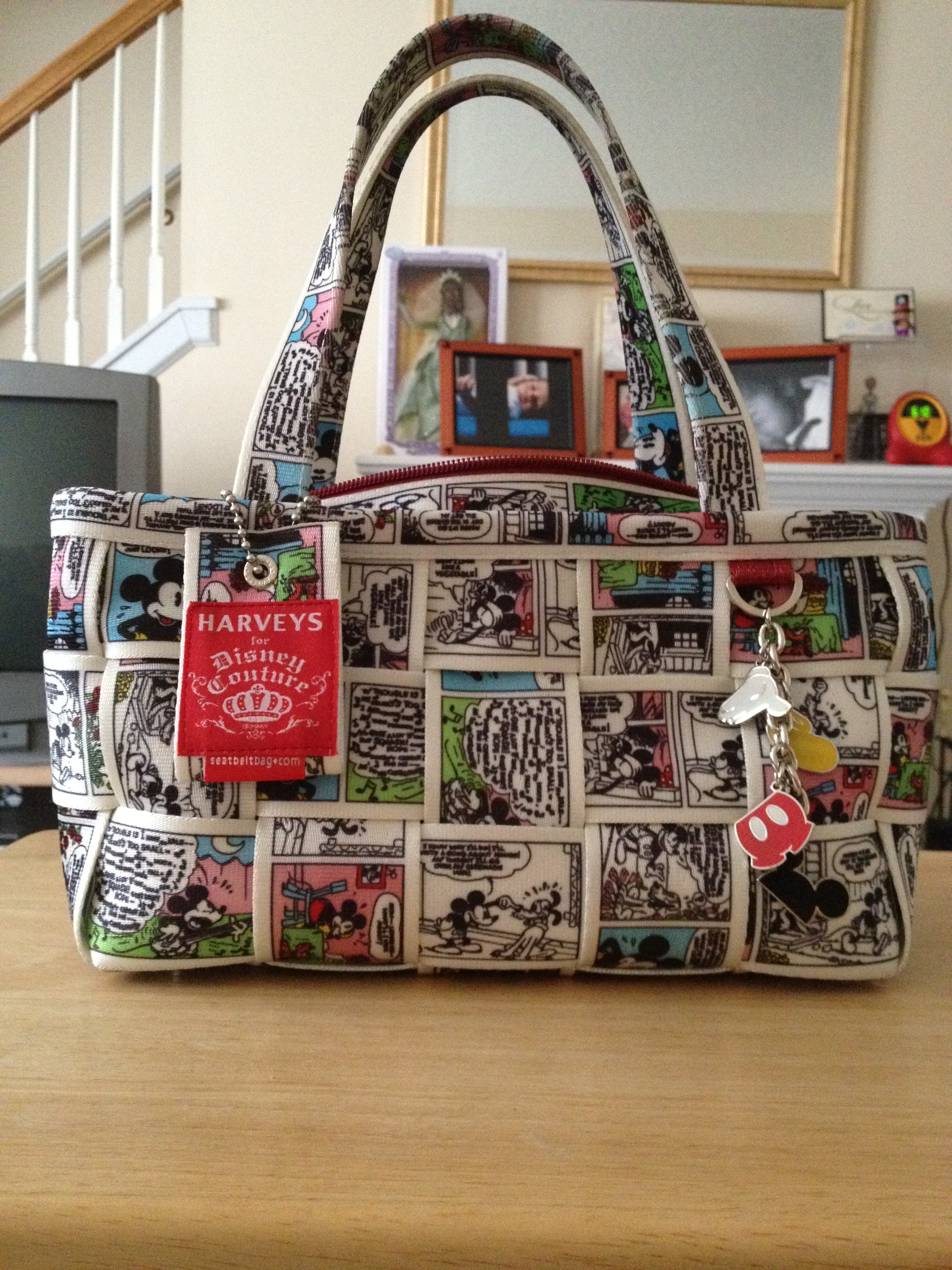 The item I am presenting this Friday is the Disney Classic Boxy made by Harveys The Original Seatbelt Bags.  I did a post on the Disney Classic Messenger that I love to carry also.   The bag really is made of automotive seatbelts printed with a Mickey Mouse comic strip.  Other Disney touches include Mickey Mouse charms, Mickey Mouse ears zipper pull and a Disney lining.  The bag can be purchased at Seatbeltbags.com.  The retail price is $134.
