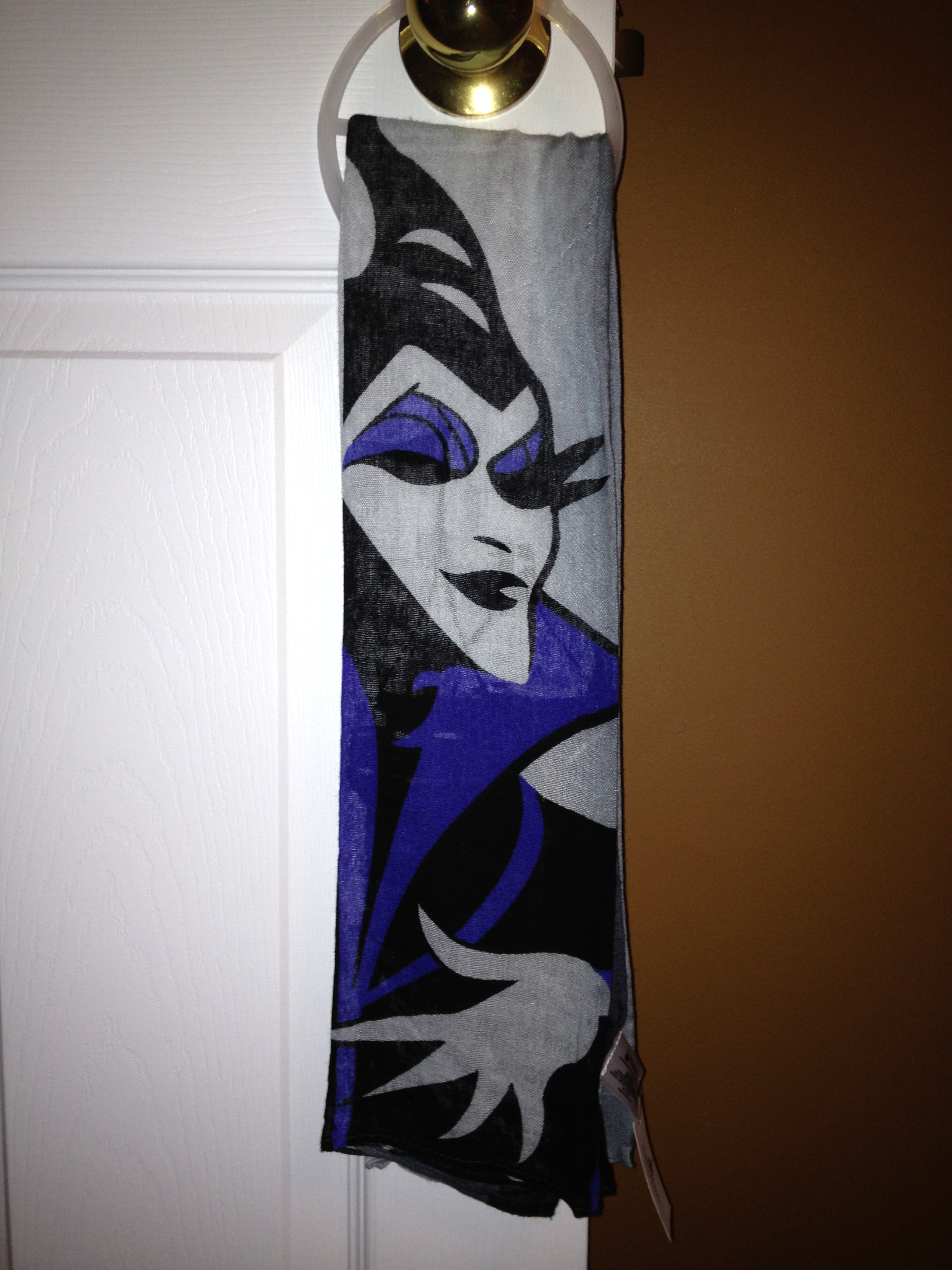 I love walking into different shops at Walt Disney World to discover new merchandise. You cannot imagine my excitement when I saw this Maleficent scarf in the gift shop of the Coronado Springs Resort. I knew I had to have it due to her being one of my favorite villains and plus it was different. The scarf retails for $19.95.
