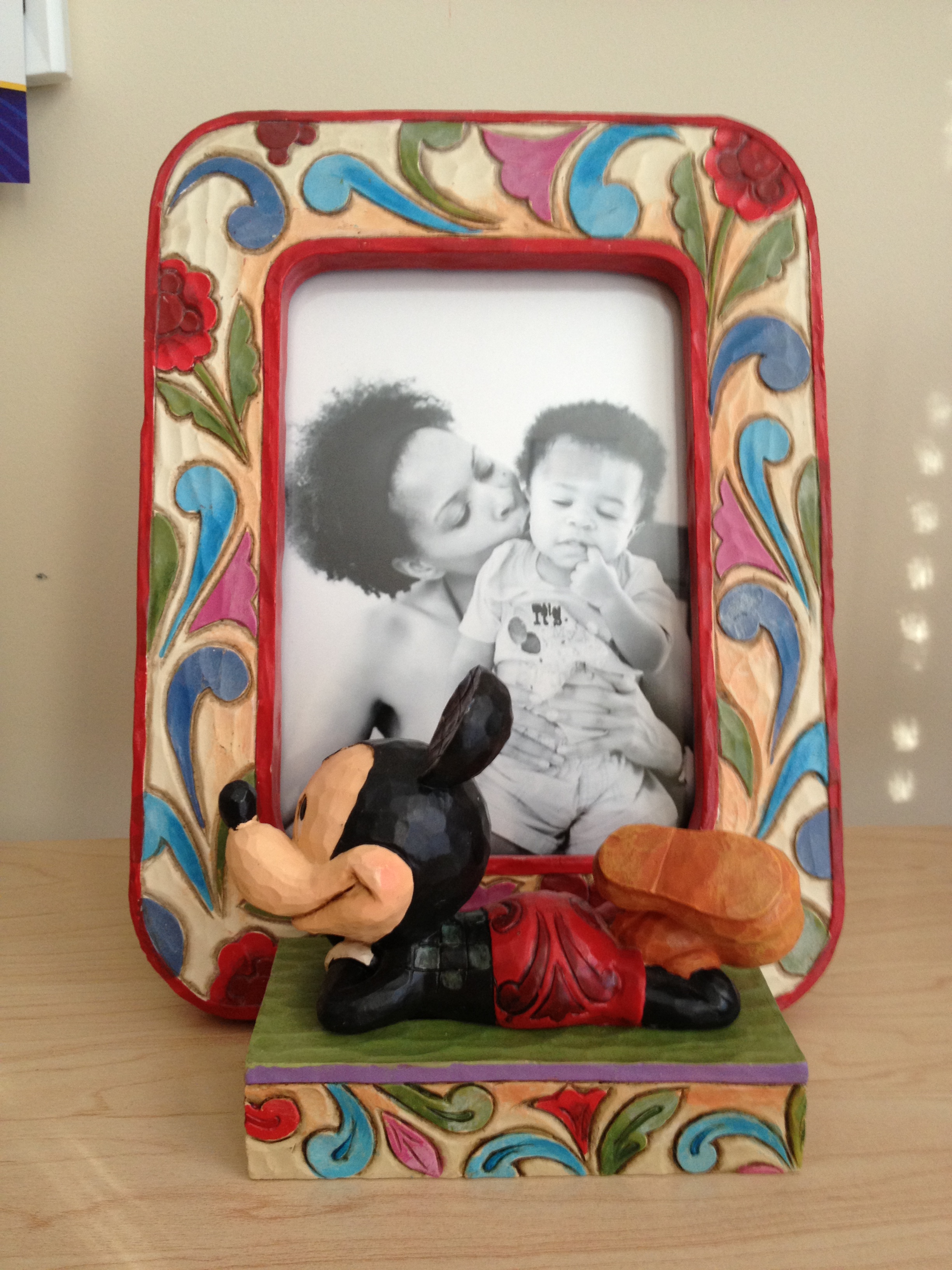 Today’s fabulous find is a birthday gift from two special friends. It is a Disney Traditions picture frame designed by Jim Shore. The name of the frame is “Pals For All Time”. The Mickey Mouse in the front of the frame is a separate piece. Oh and the cute little guy in the picture, is always fabulous.