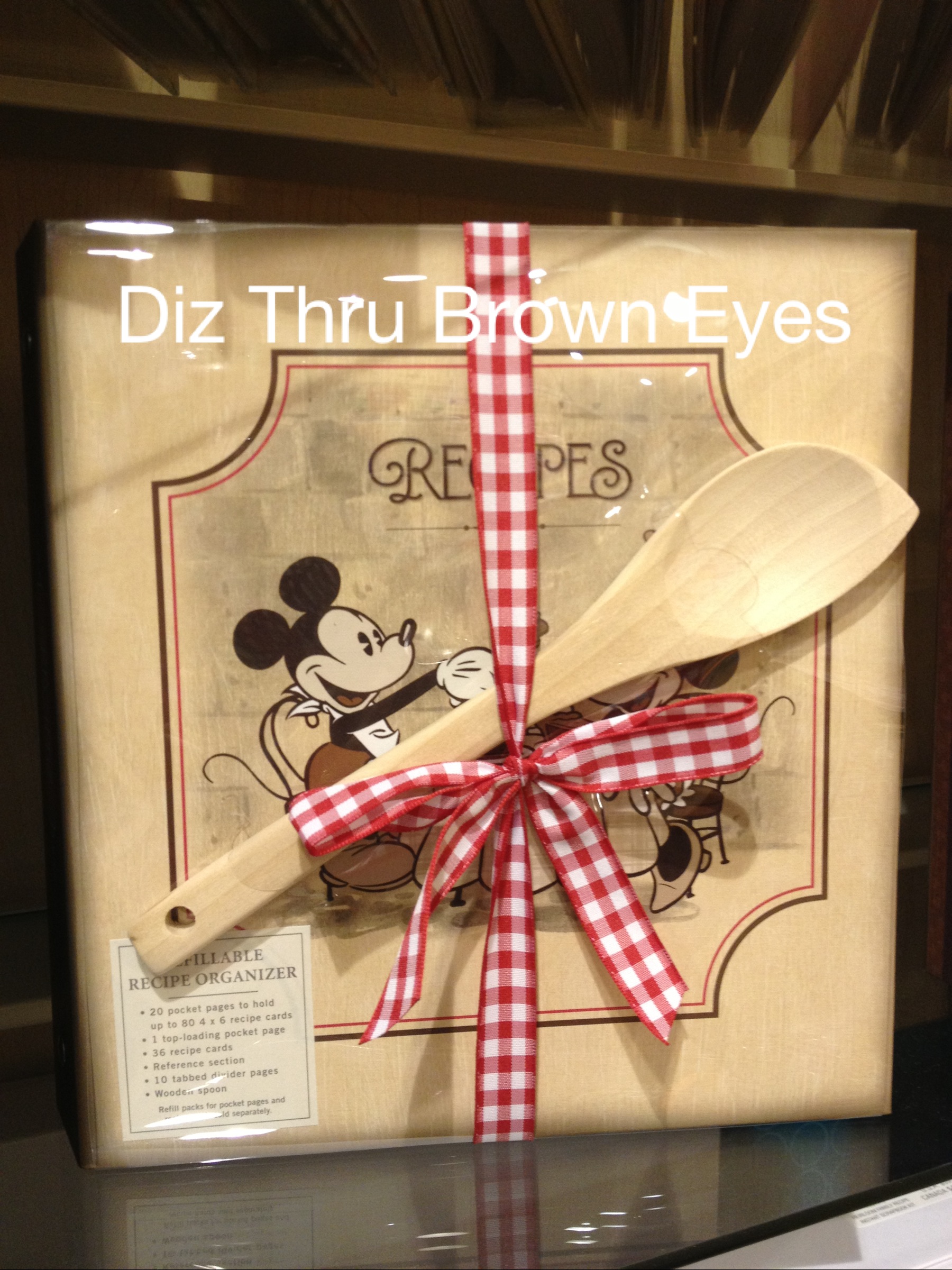 Mickey and Minnie Refillable Recipe Organizer that includes: 20 pocket pages to hold up to 80 4×6 recipe cards, 1 top-loading pocket page, 36 recipe cards, Reference section, 10 tabbed divider pages, and Wooden Spoon