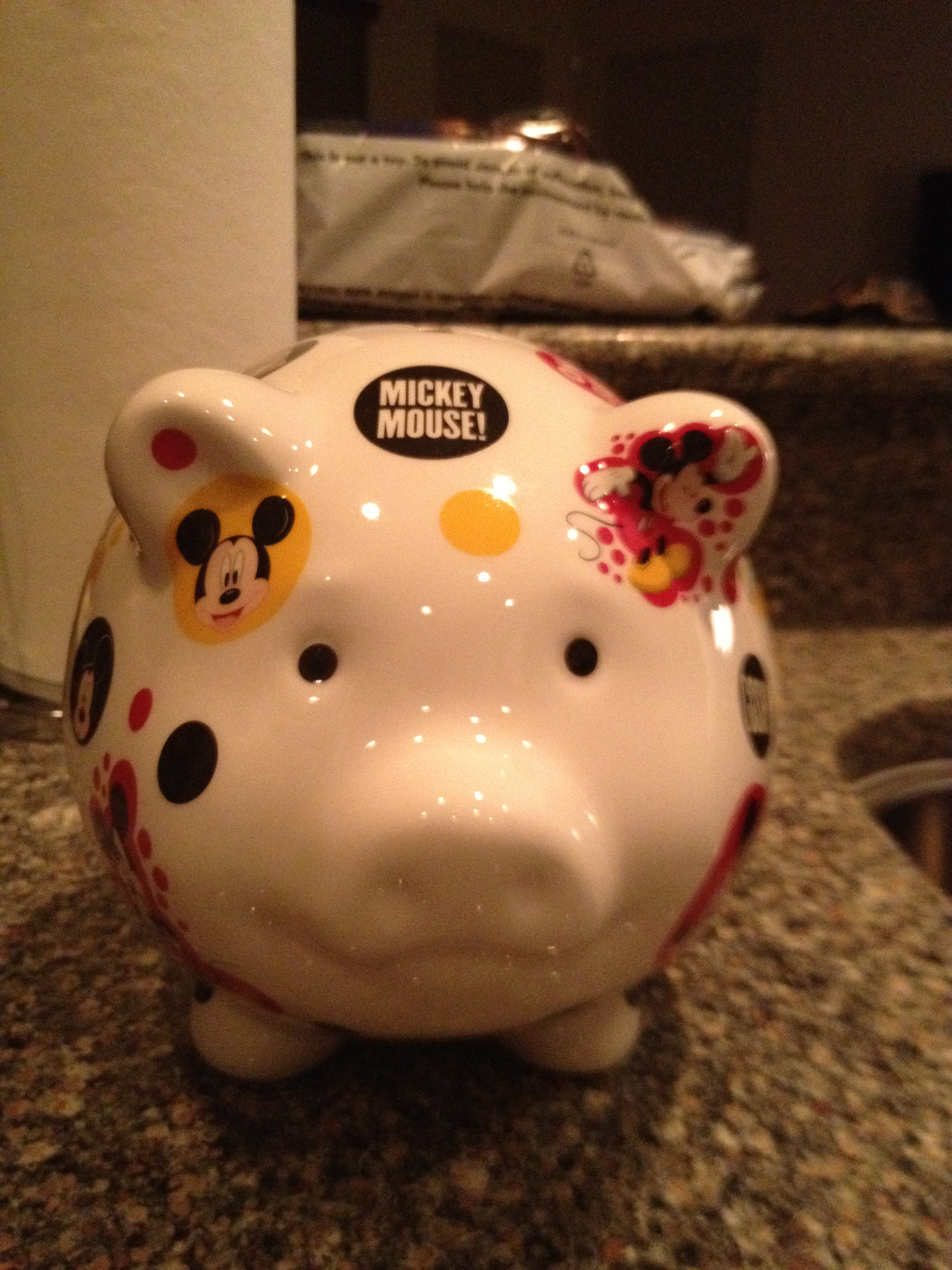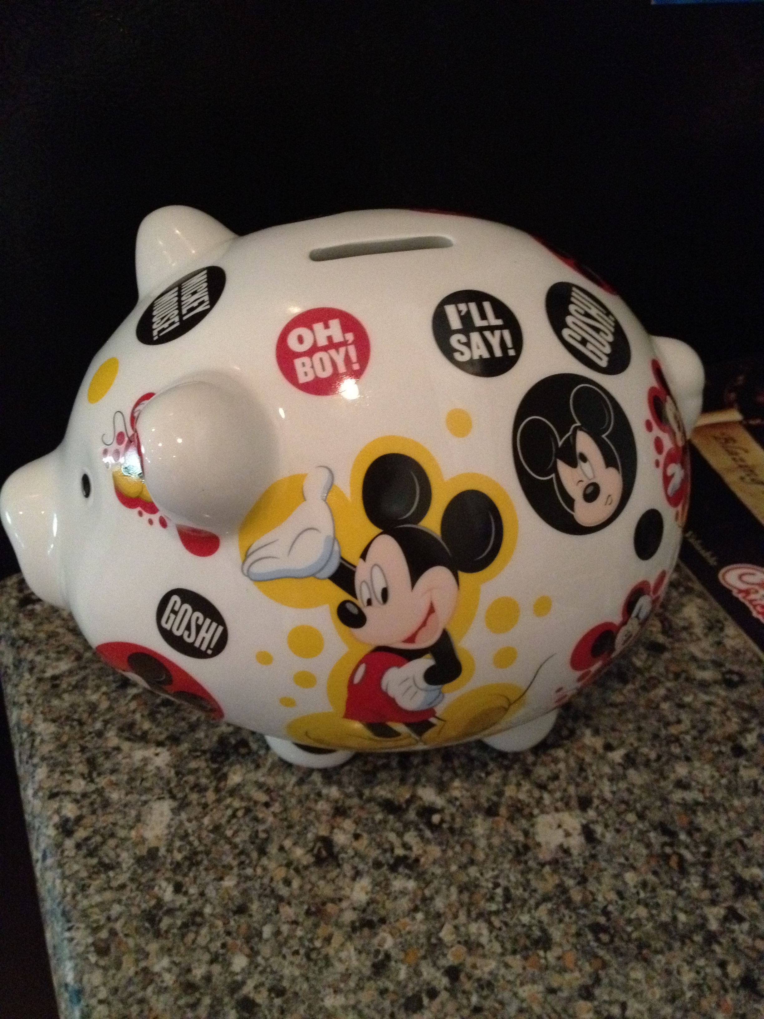 The item being presented this Friday is a Disney inspired piggy bank. It appears that piggy banks are making a comeback. So why shouldn’t Disney hop on board? I saw at least four styles – 2 with Mickey Mouse themes, a blue one with Toy Story and Cars theme, and a pink one with the Princess on it. My Mickey Mouse themed piggy bank will help me save change for the “Disney Fund”. The piggy bank retails at $19.95.