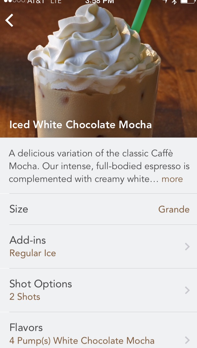 When finishing up my day at work, I decided to try out the feature. Ordering an iced white chocolate mocha was easy. I was able to choose size as well as change additions, like pumps of syrup, coffee, type of milk, and whip.