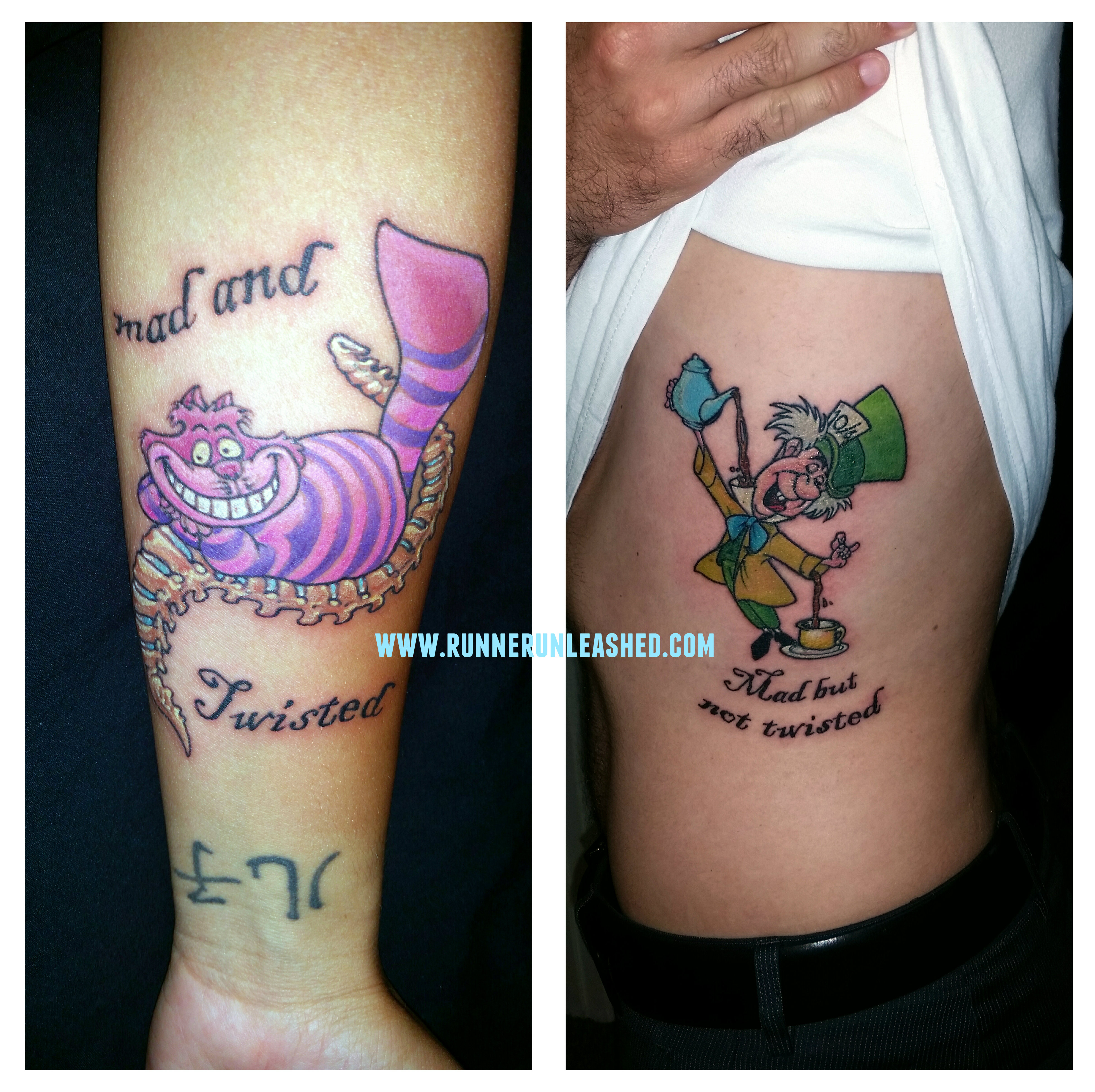 As explained above, I got the tattoo because completing the 39.3 Goofy’s Race and a Half Challenge made me feel like I could do anything. Being a Scoliosis runner is no easy task, I struggle daily and running is the only time I am pain free. As far as my second one, I have a love with Alice in Wonderland. In many ways I can relate as I see life as she sees it in Wonderland. Life is something you must enjoy and see the beauty in everything. I wanted to have a permanent reminder of what running has taught me. Through it, I’ve learned about my REAL strength to overcome my daily obstacles. I put the cheshire cat sitting on a twisted spine, with the words “mad and twisted” around it. It’s a reminder that to deal with what I go through one has to be a little mad and twisted. Twisted signifying my twisted spine 😉 My husband also got a tattoo in honor of me and everything I have gone through and will continue to go through. As the cheshire cat says “Everyone here is mad. I’m mad. You’re mad. It’s only by chance n’ careful planning if you’re not! “
