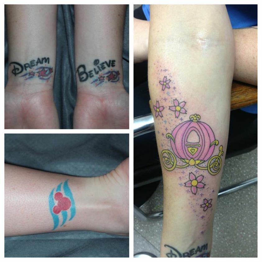 In fall of 2011 we began tattooing the back piece. My artist was Tyler Alderson of Tantrix Body Art in Saskatoon SK. He spent hours researching pictures of the castle, partners statue and pictures of the characters I wanted. First session was spent placing each individual stencil that he’d drawn out on my back, and then he tattooed the outlining on everything. Next trip we did the back ground color. A couple months later he began tattooing castle and characters. In July of 2012 he finished tattooing my back by doing back to back days for a total of 15 hours over 2 days to finish it up. We travelled 6 hours each way while having this tattoo done so I really just wanted it finished!! In the end it was around 40 hours of tattoo time done over 5 sessions in 6 months. Total cost of this back piece was about $5200 not including gas, hotel stays etc. but it was worth every cent!!! Once my back was done I continued adding to my collection with a Tim Shumate Tinkerbell on my arm tattoed by Jason Doll of Dolls Studios. This was about 4 hours. As well as he did my wrists with words believe and dream! I then attended a tattoo show where I had a guest artist Jason Jones do my thumper tattoo. I have an Eeyore on my ankle done by Kirk Shepard, as well as Simba. I do have a couple of non-Disney tattoos including my water lily done by same artist that did my back. This piece won best tattoo of a tattoo show I attended. Also have my kitty Sammy tattooed as a memorial piece also done by Jason Doll. My most recent piece is Marie done by Dan Sydlo of Dolls Studios. Other small tattoos I have are a flower piece on my arm that I am currently making plans to add princesses to, a Tinkerbell silhouette, a dragonfly with hidden Mickeys and a Mickey on back of my neck.
