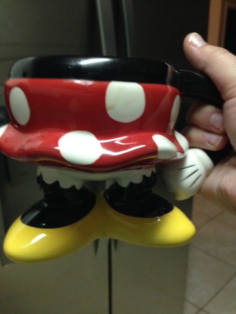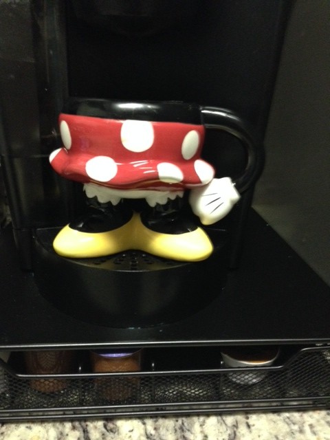 Today’s guest coffee mug is from Katie F. Katie said “My hubby got me this mug for Easter, and it’s my new favorite mug! It features Minnie’s red and white polka dot dress along with her signature yellow shoes. Minnie Mouse has always been my favorite, so I’m in love with this mug! It retails for about $24 on Amazon”.