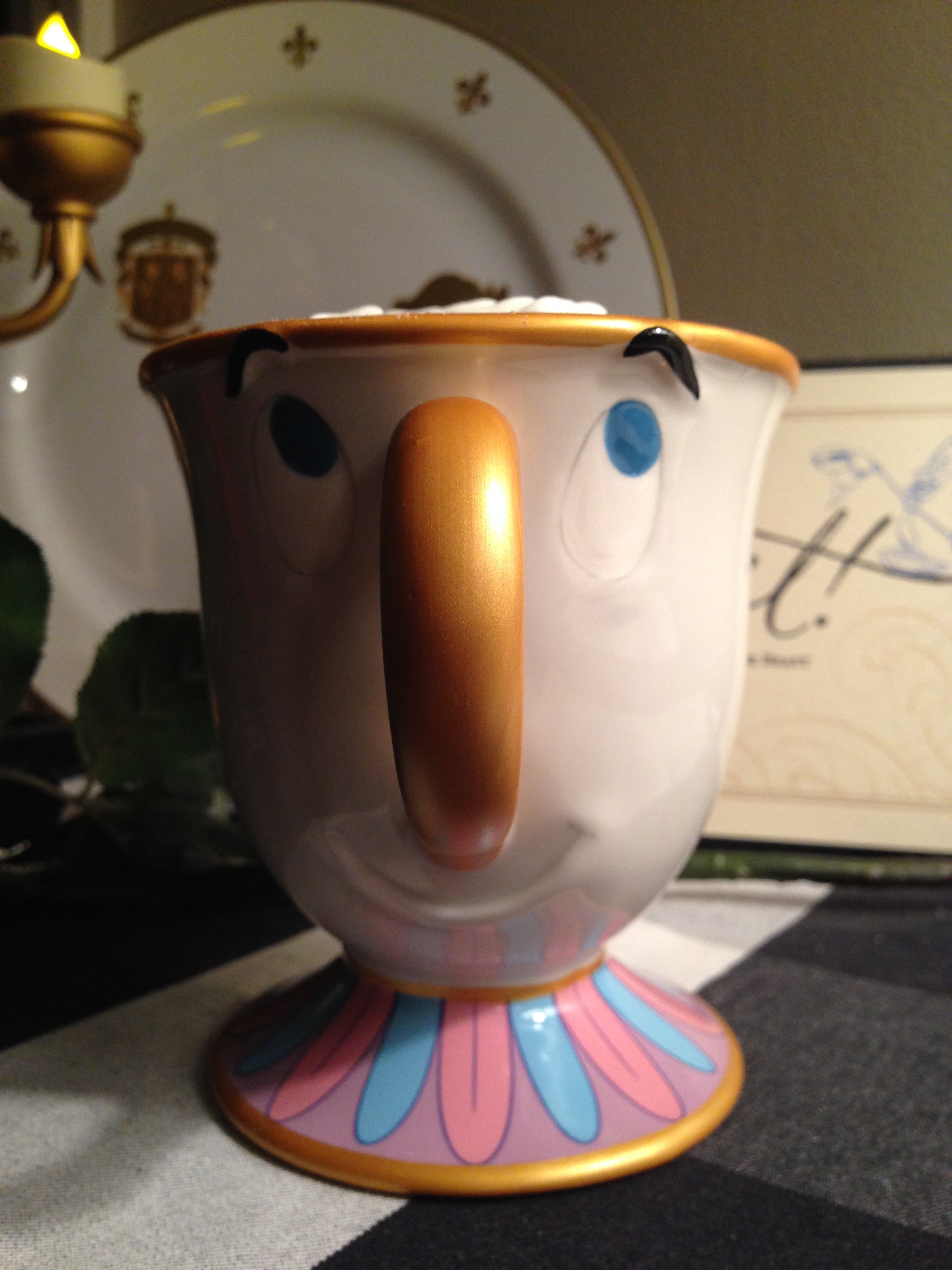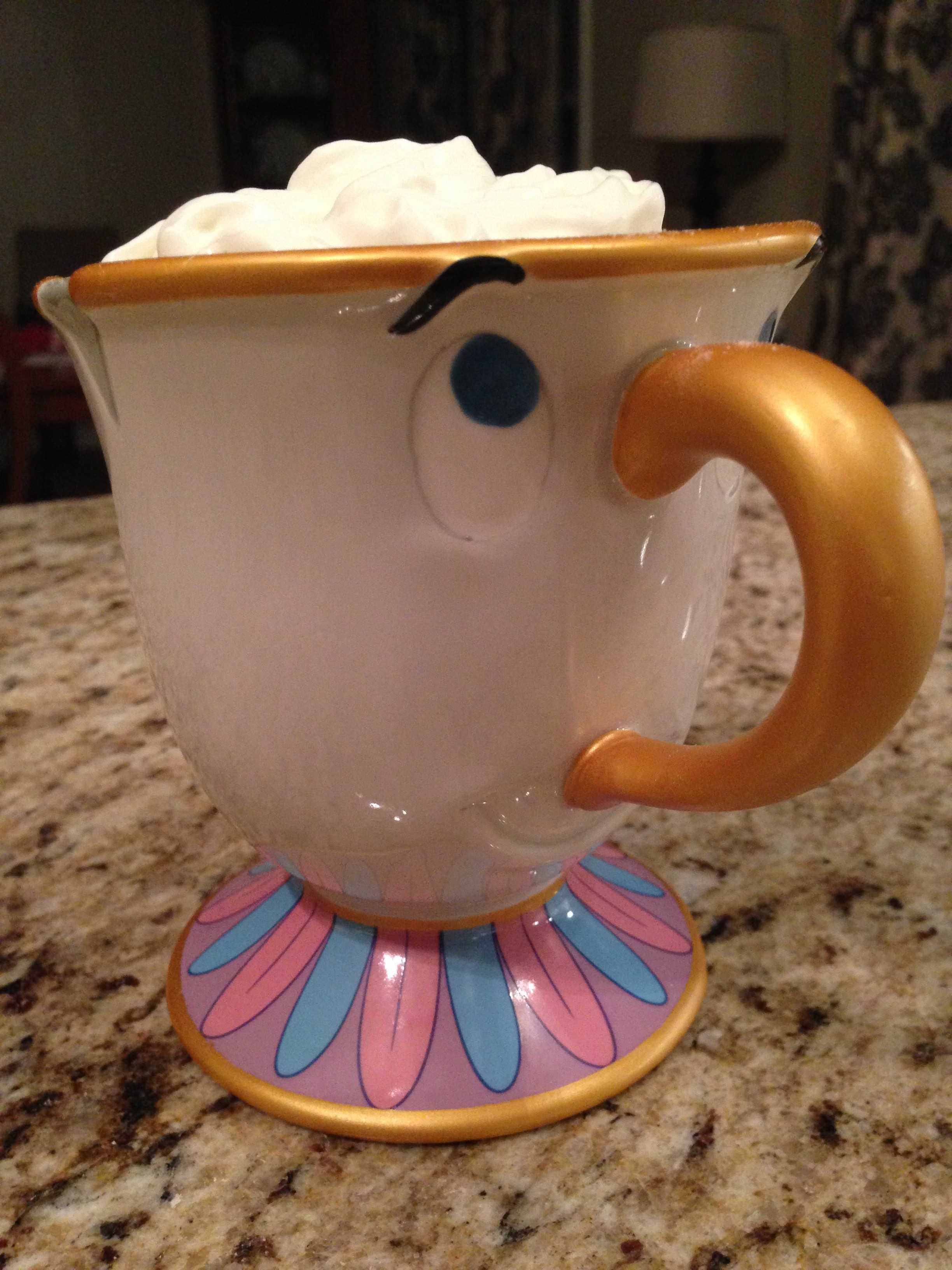 Today’s guest coffee mug comes from Jenny P ( @MrsJPotts). Jenny stated “I thought I would send you a picture of one of my favorite mugs for Mean Muggin’ Monday. I have been wanting the Chip mug for a while now since my name is actually Mrs. Potts. We visited Walt Disney World three times last year and I could not find him! Luckily, my mother in law lives in Orlando and purchased him for me for Christmas at Downtown Disney. In these pictures, Chip is enjoying a cup of homemade hot cocoa from a local WV restaurant called Later, Gator”.