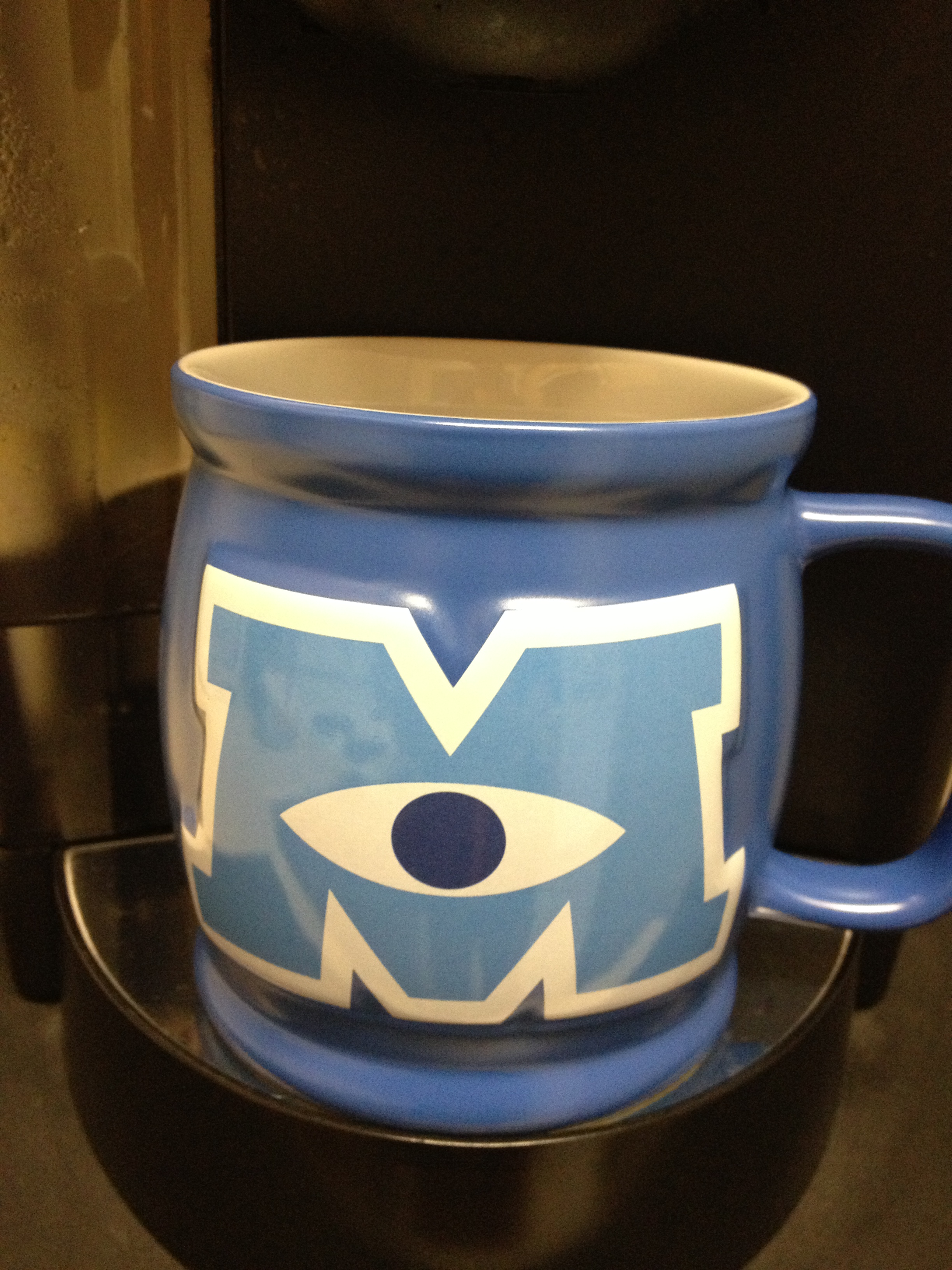 Today’s mug is showing my school spirit for Monsters University. I guess this mug was made for a monstrous appetite that needs huge quantities of caffeine to study. I purchased the mug at the Disney Store. It is also available at DisneyStore.com and retails for $12.50.