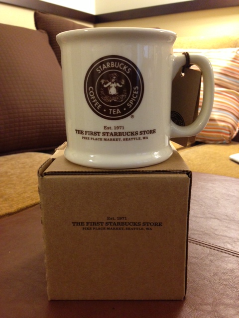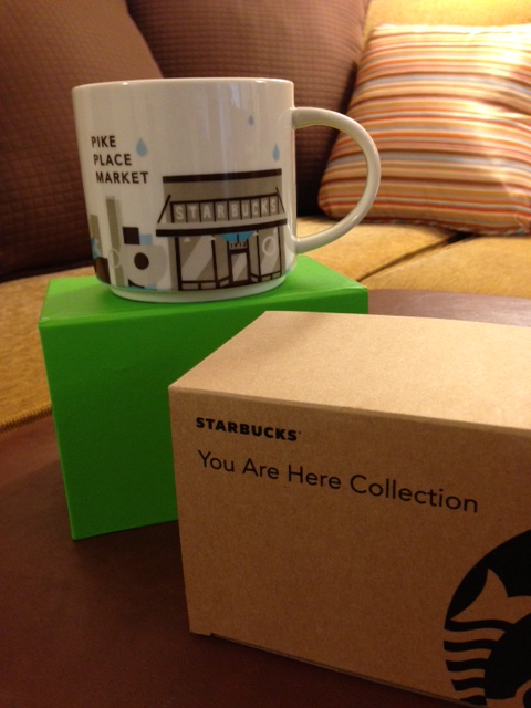 My mug is from the “You Are Here” collection. The mug holds 14oz and retails for $10.95. It is chocolate brown on the inside and the storefront of the first Starbucks at 1912 Pike Place Market on the outside.