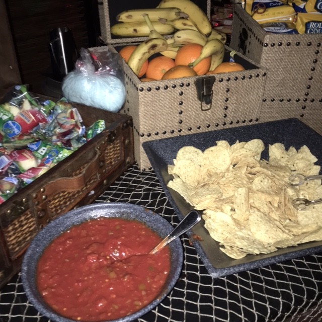The room was large and open with chairs and tables scattered about. The snacks consisted of cotton candy, chips, salsa, cake, chocolate gold doubloons, popcorn, pretzels, and drinks. Oh, I almost forgot to mention the frozen treats consisting of Mickey ice cream sandwiches and fruit pops. After our fill of snacks and taking pictures with pirates, it was time to head to the boats.