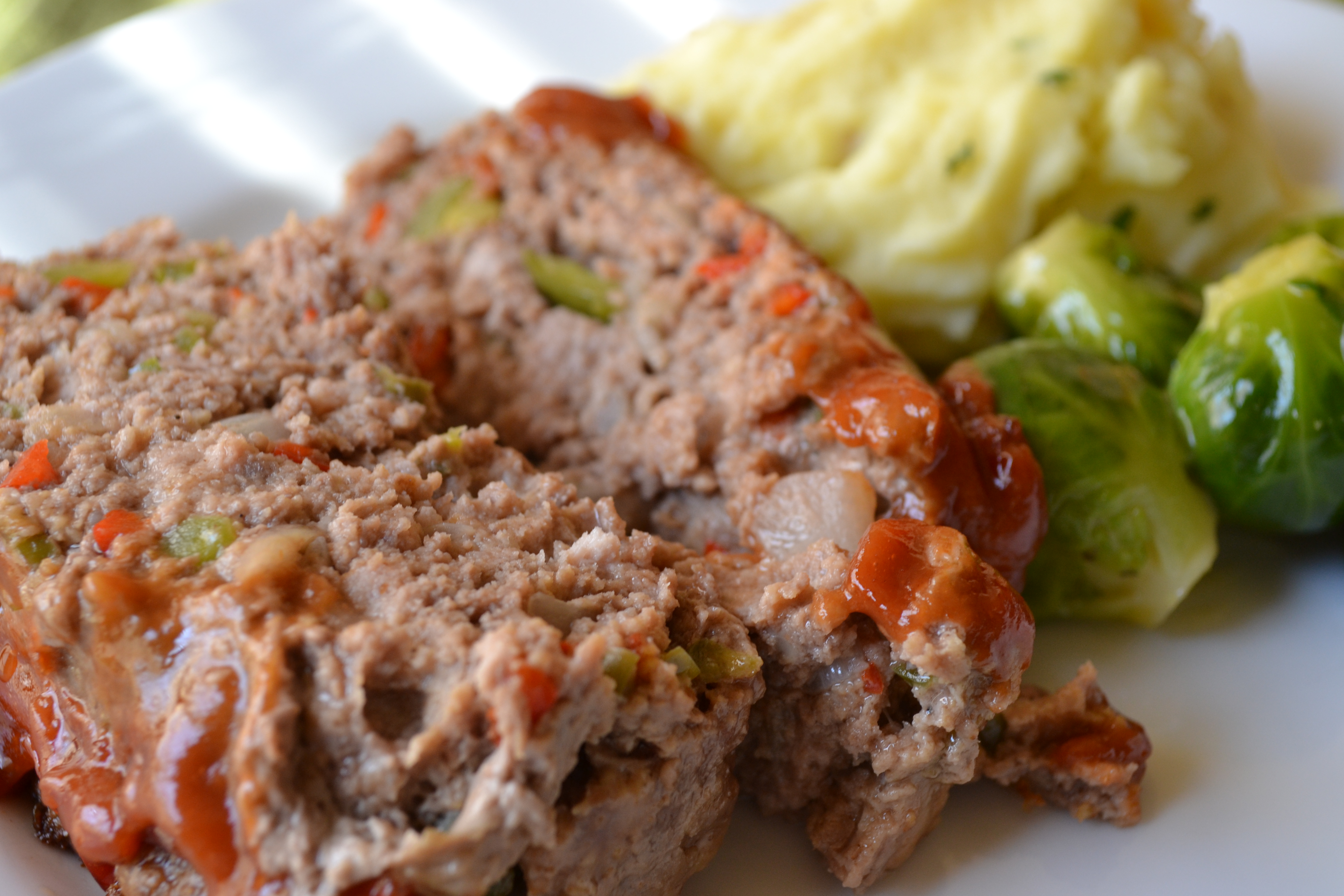 I have never eaten at this restaurant, but read good things about their meatloaf. I usually make Turkey Meatloaf but decided to give this a go. I knew it would have lots of flavor and not dry out with the combination of beef and pork, and it did not disappoint! I love a meatloaf with a sweet glaze and the addition of the Dijon mustard gave it a little kick. My wonderful host here at Diz Thru Brown Eyes even ate some (and if she hasn’t told you yet, she is a very picky eater). She did end up picking out the red and green bell pepper but I wouldn’t expect anything less from her.