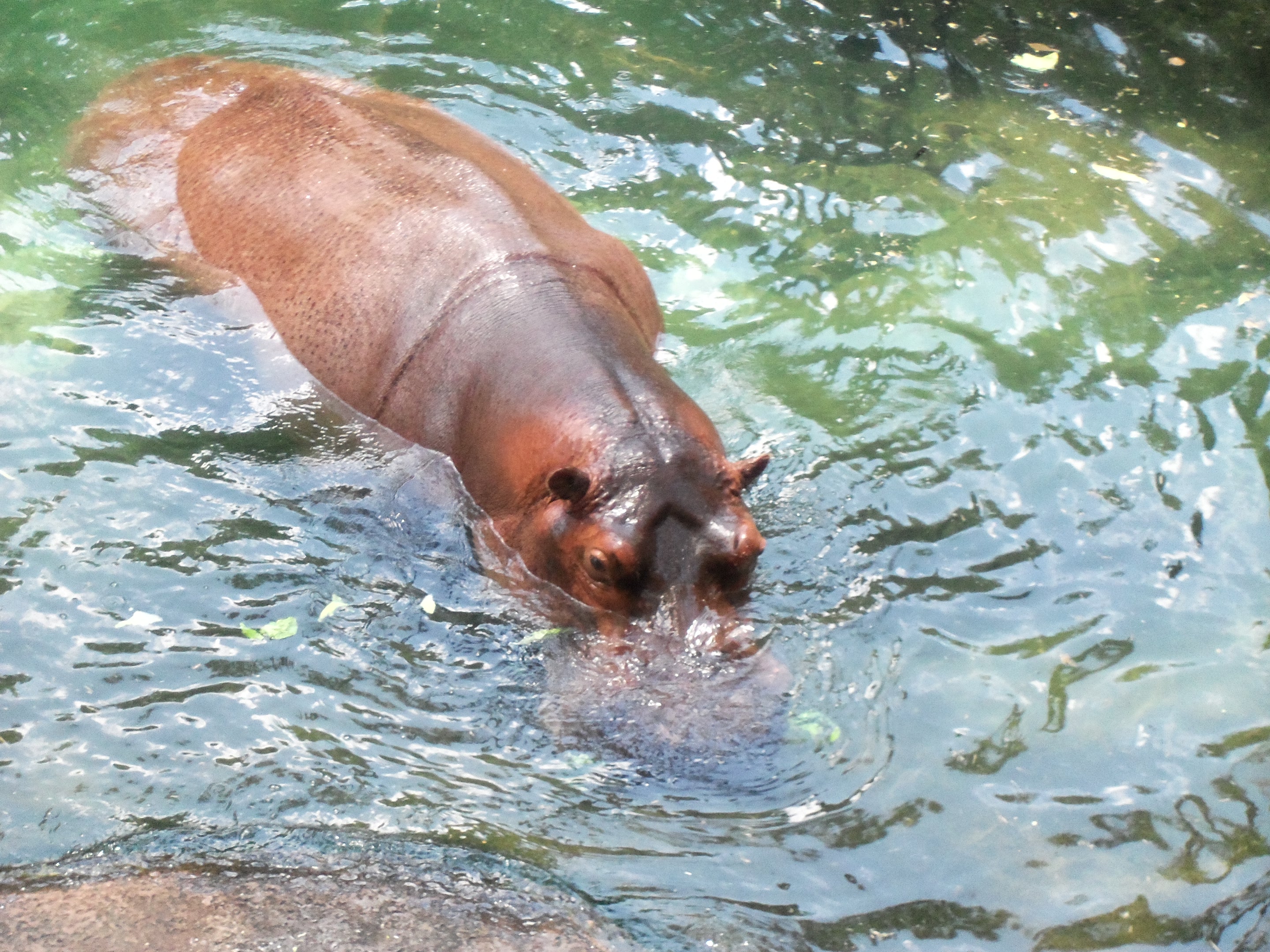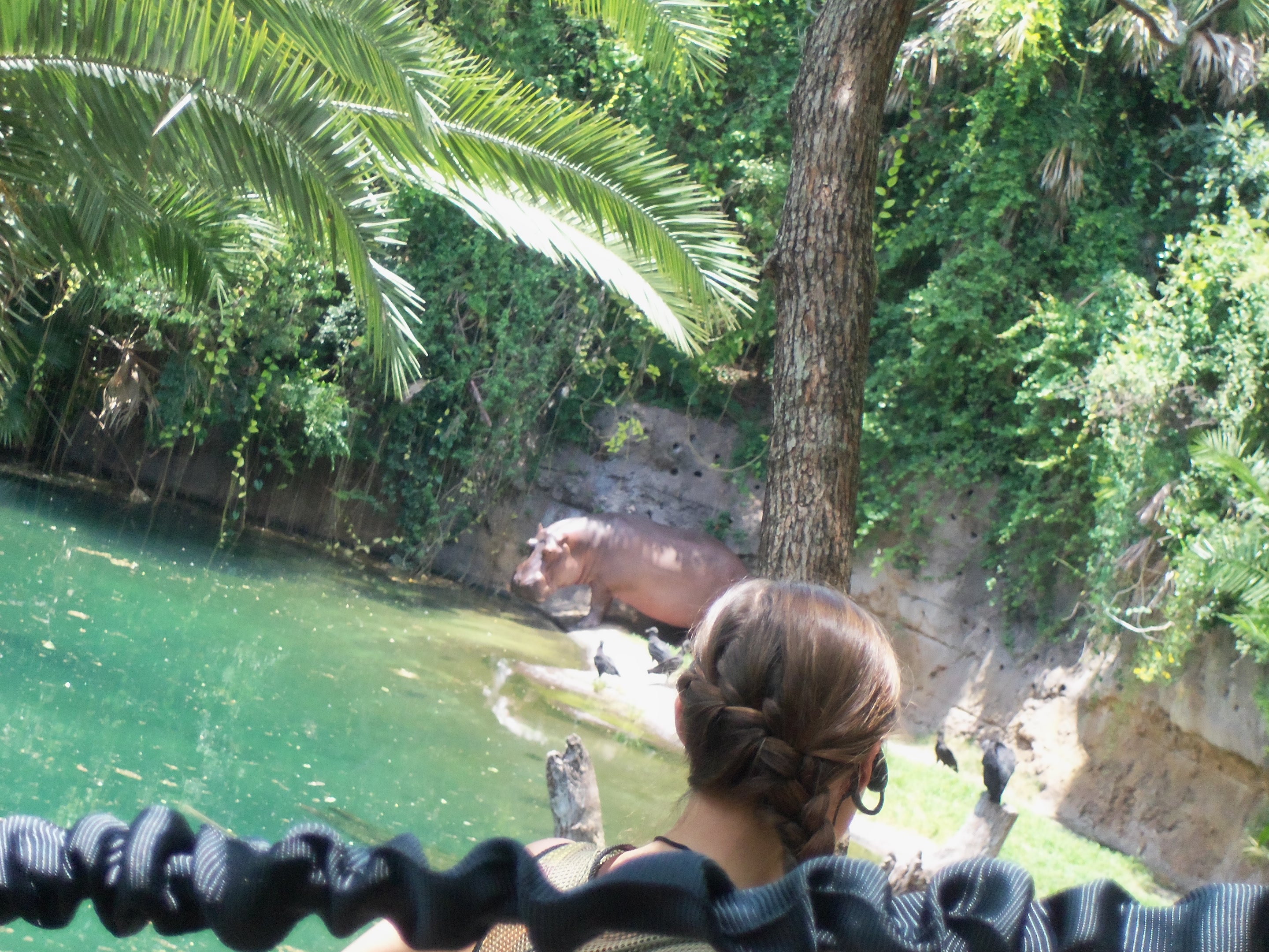 Our first stop was the hippopotamus. A Cast Member told us about the two male hippos, Henry and Huns. Henry was the dominant male and Huns was described as being submissive. A third hippo, Nacho, was removed due to him and Huns getting into altercations. Huns is considered the young one of the group. Henry appeared as if he did not want to be bothered. Huns came over when it was signaled he would be getting fed. The Cast Member gave him lettuce. You are standing on a ledge and can lean to look over. Your harness is attached to a “rail” to secure you.