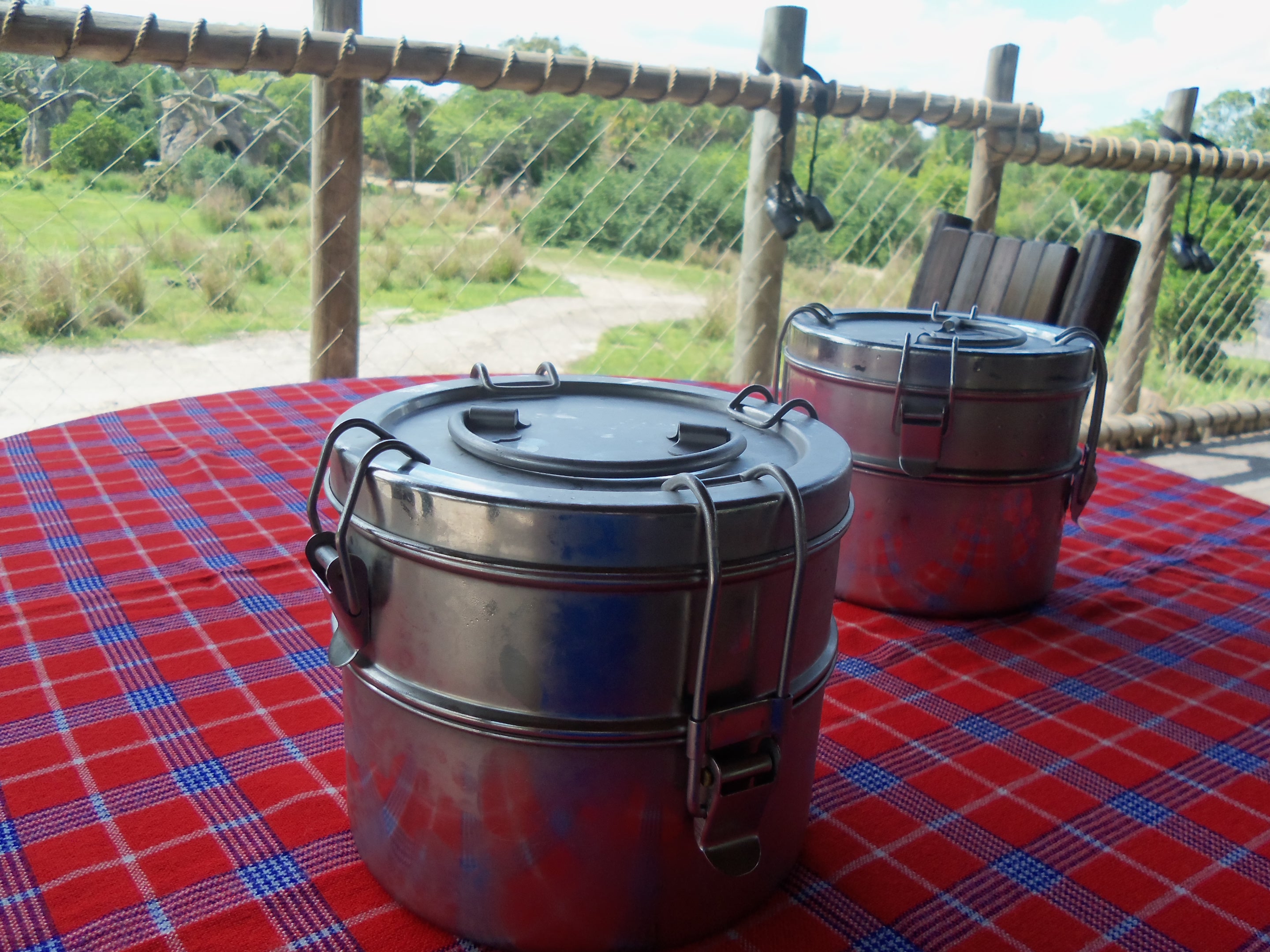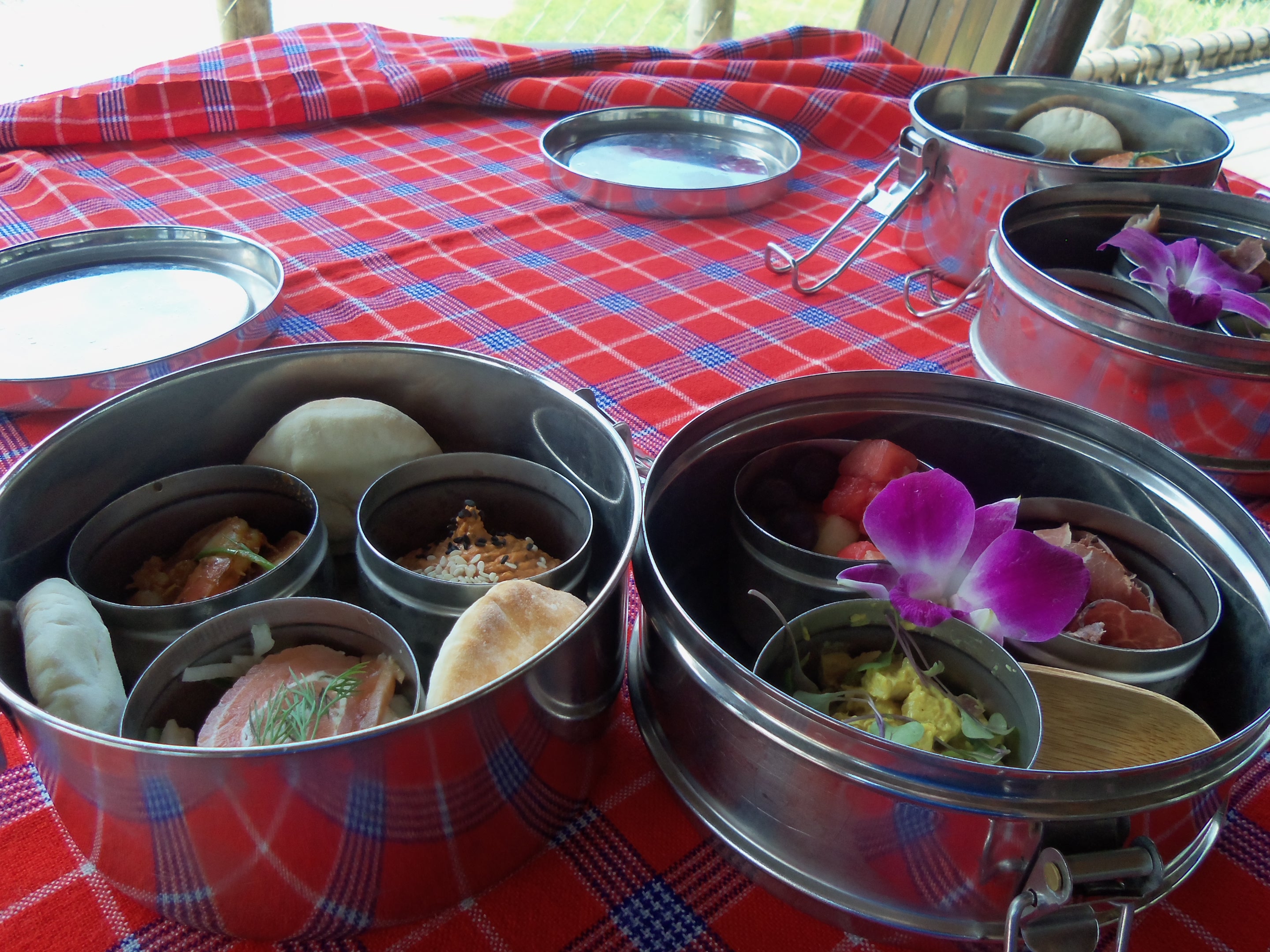 Our safari truck brought us to each lunch at Boma, not to be confused with the restaurant at Animal Kingdom Lodge. Lunch was severed in containers that reminded me of my Girl Scout days. The top container had chicken curry salad, dried meats, and marinated fruit. The bottom container had tomato hummus, mini pitas, shrimp, and smoked salmon with dill. Jungle juice, which is wonderful, was served also. I am a picky eater if you did not know. I liked the chicken curry salad the best. I did try the salmon, shrimp, and tomato hummus.